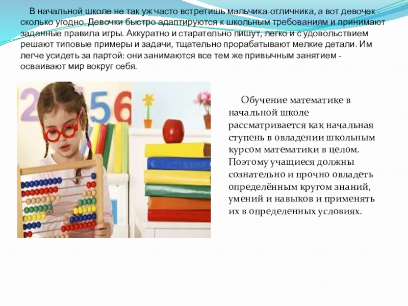 Обучение математике в начальной школе рассматривается как начальная ступень в овладении школьным курсом математики в целом. Поэтому учащиеся должны сознательно и прочно овладеть определённым кругом знаний, умений и навыков и применять их в определенных условиях.