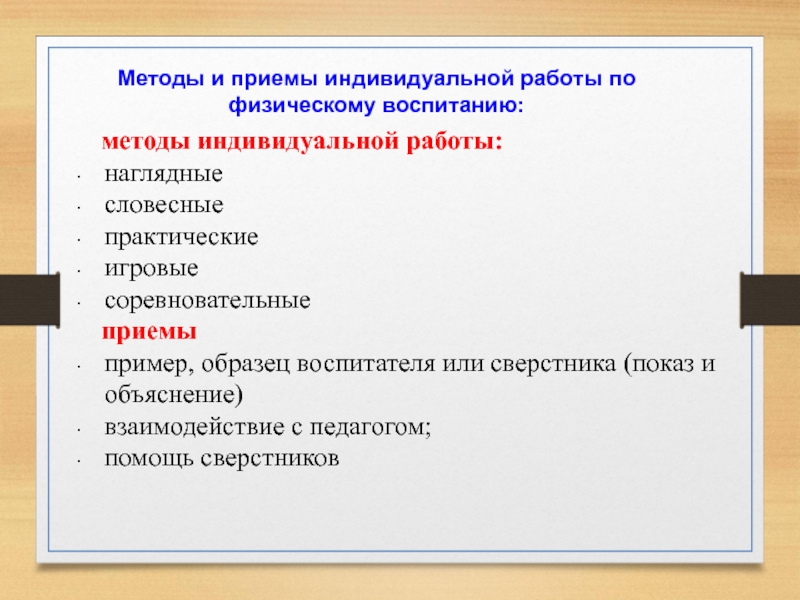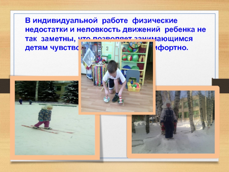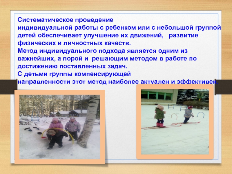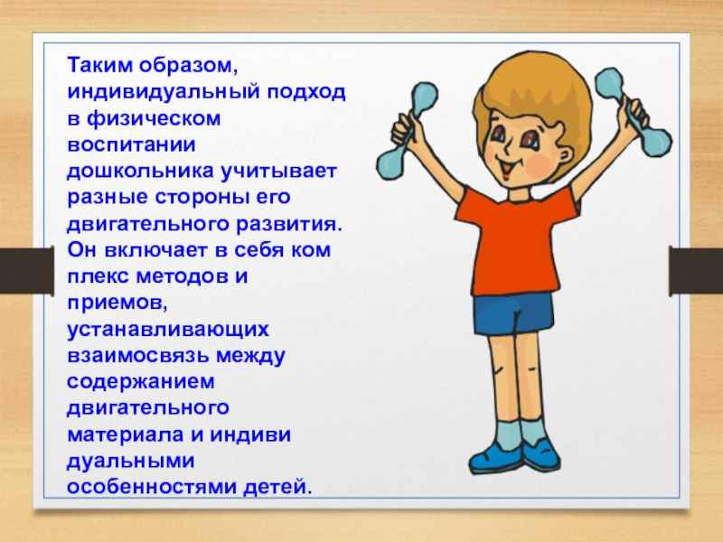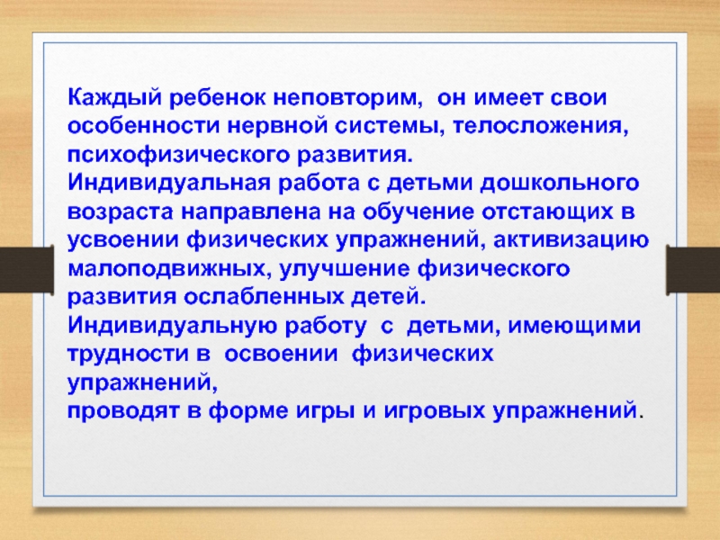 Индивидуальная работа с детьми дошкольного возраста направлена на обучение отстающих в усвоении физических упражнений, активизацию малоподвижных, улучшение физического развития ослабленных детей.
