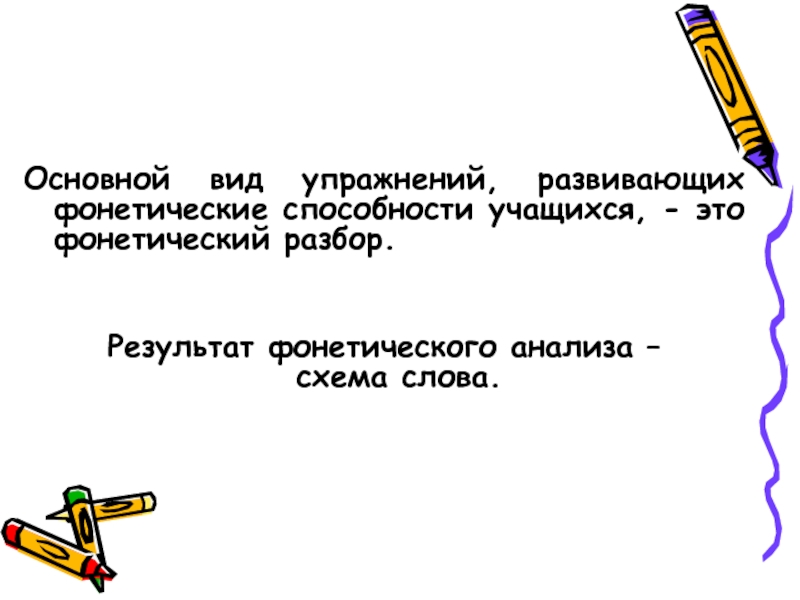 Слайд 13Основной вид упражнений, развивающих фонетические способности учащихся, - это фонетический разбор.