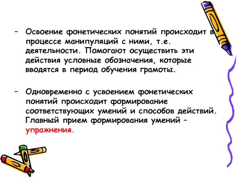 Одновременно с усвоением фонетических понятий происходит формирование соответствующих умений и способов действий. Главный прием формирования умений – упражнения.