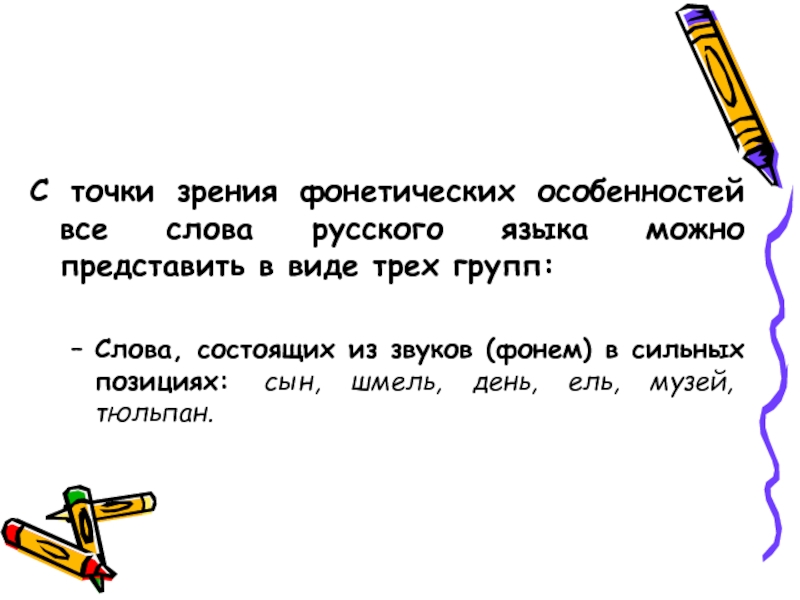 Слайд 4С точки зрения фонетических особенностей все слова русского языка можно представить