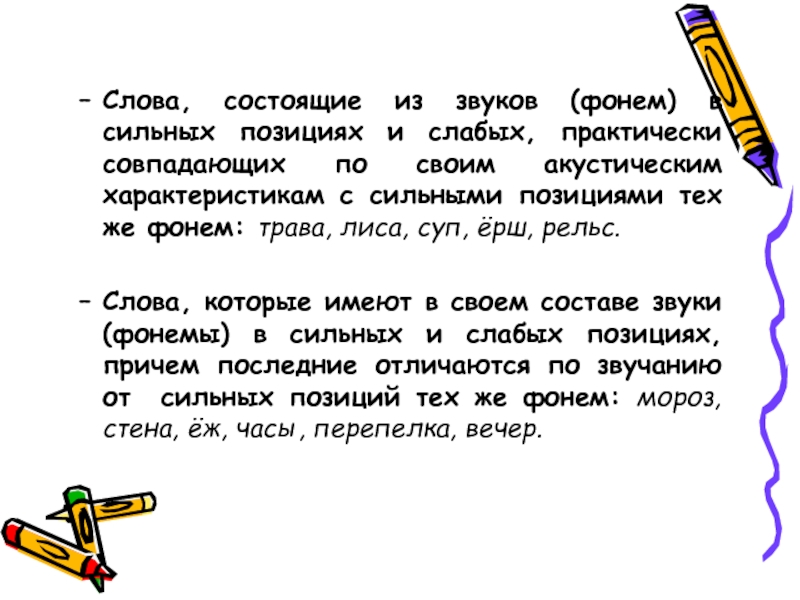 Слайд 5Слова, состоящие из звуков (фонем) в сильных позициях и слабых, практически
