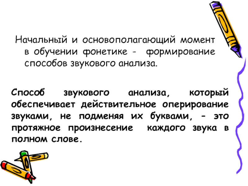 Слайд 3Начальный и основополагающий момент в обучении фонетике - формирование способов звукового