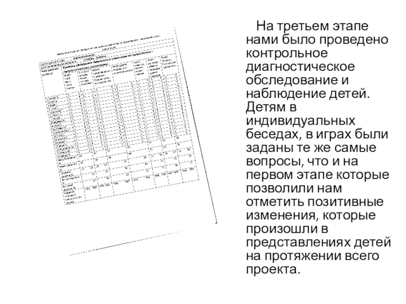 диагностическое обследование и наблюдение детей. Детям в индивидуальных беседах, в играх были заданы те же самые вопросы, что и на первом этапе которые позволили нам отметить позитивные изменения, которые произошли в представлениях детей на протяжении всего проекта.
