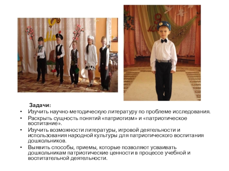 Изучить возможности литературы, игровой деятельности и использования народной культуры для патриотического воспитания дошкольников.