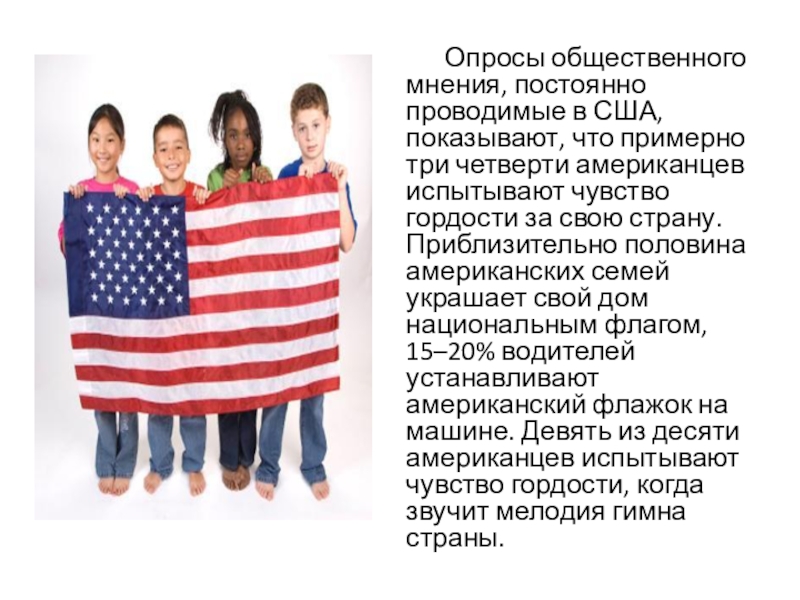 в США, показывают, что примерно три четверти американцев испытывают чувство гордости за свою страну. Приблизительно половина американских семей украшает свой дом национальным флагом, 15–20% водителей устанавливают американский флажок на машине. Девять из десяти американцев испытывают чувство гордости, когда звучит мелодия гимна страны.