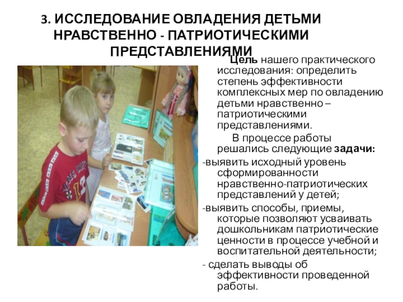 Слайд 213. ИССЛЕДОВАНИЕ ОВЛАДЕНИЯ ДЕТЬМИ НРАВСТВЕННО - ПАТРИОТИЧЕСКИМИ ПРЕДСТАВЛЕНИЯМИ