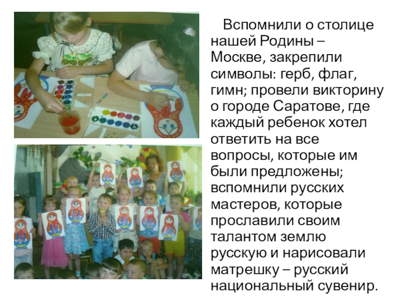 закрепили символы: герб, флаг, гимн; провели викторину о городе Саратове, где каждый ребенок хотел ответить на все вопросы, которые им были предложены; вспомнили русских мастеров, которые прославили своим талантом землю русскую и нарисовали матрешку – русский национальный сувенир.