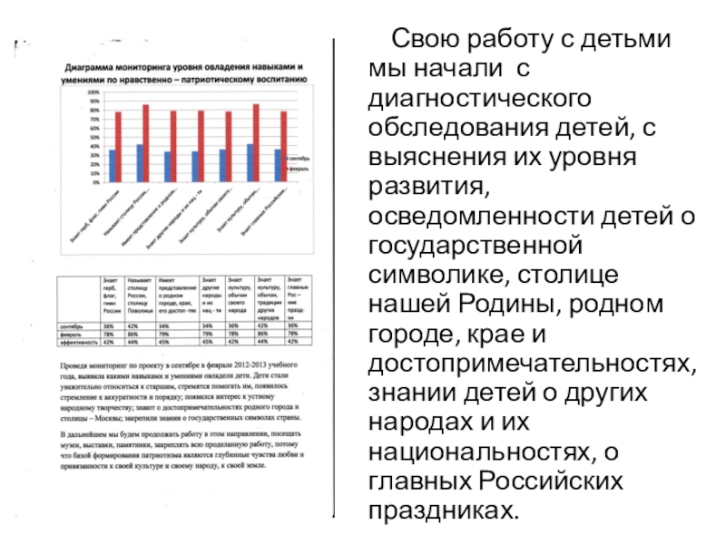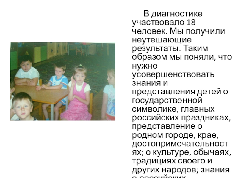 диагностического обследования детей, с выяснения их уровня развития, осведомленности детей о государственной символике, столице нашей Родины, родном городе, крае и достопримечательностях, знании детей о других народах и их национальностях, о главных Российских праздниках.