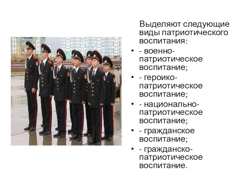 Слайд 10 Выделяют следующие виды патриотического воспитания:
