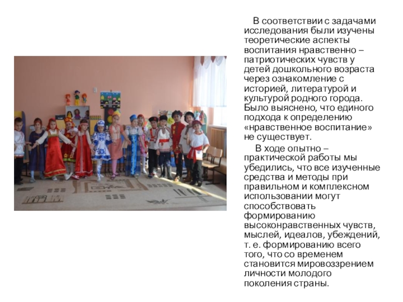 были изучены теоретические аспекты воспитания нравственно – патриотических чувств у детей дошкольного возраста через ознакомление с историей, литературой и культурой родного города. Было выяснено, что единого подхода к определению «нравственное воспитание» не существует.