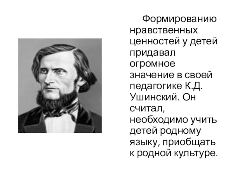 огромное значение в своей педагогике К.Д. Ушинский. Он считал, необходимо учить детей родному языку, приобщать к родной культуре.