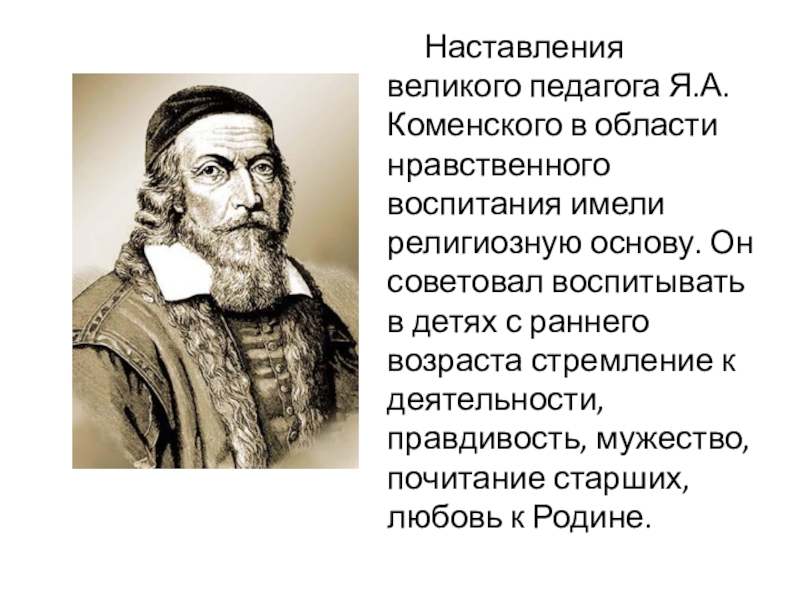 Слайд 4 Наставления великого педагога Я.А. Коменского в