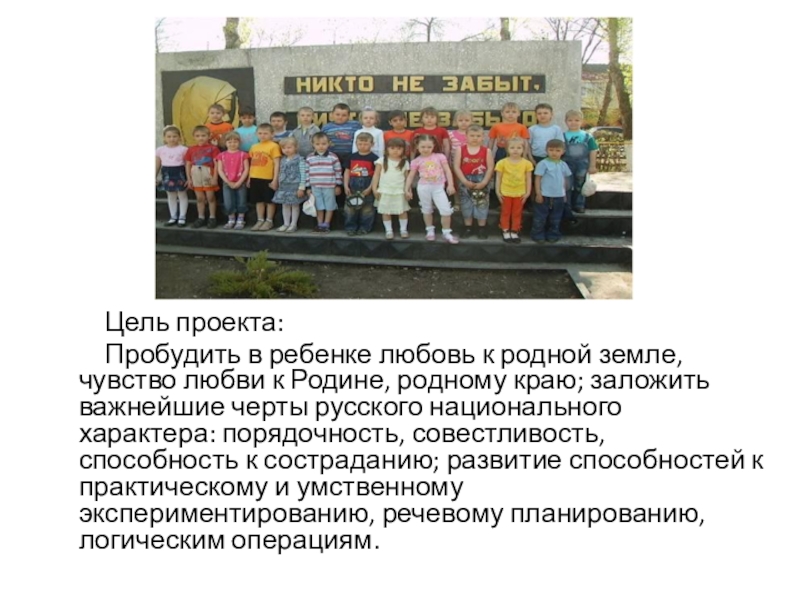 Пробудить в ребенке любовь к родной земле, чувство любви к Родине, родному краю; заложить важнейшие черты русского национального характера: порядочность, совестливость, способность к состраданию; развитие способностей к практическому и умственному экспериментированию, речевому планированию, логическим операциям.