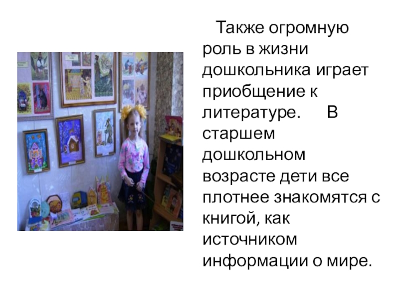приобщение к литературе. В старшем дошкольном возрасте дети все плотнее знакомятся с книгой, как источником информации о мире.