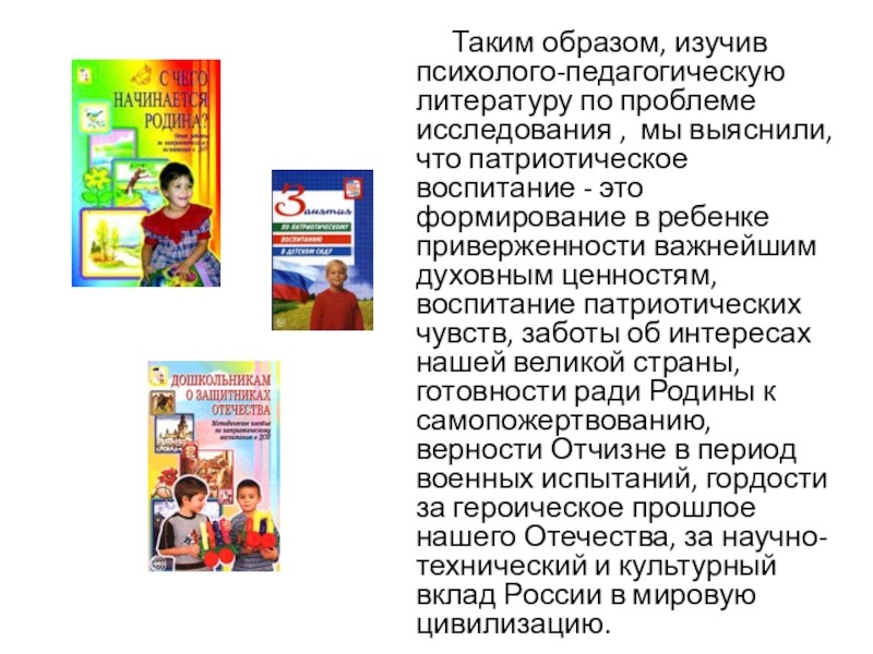 проблеме исследования , мы выяснили, что патриотическое воспитание - это формирование в ребенке приверженности важнейшим духовным ценностям, воспитание патриотических чувств, заботы об интересах нашей великой страны, готовности ради Родины к самопожертвованию, верности Отчизне в период военных испытаний, гордости за героическое прошлое нашего Отечества, за научно-технический и культурный вклад России в мировую цивилизацию.
