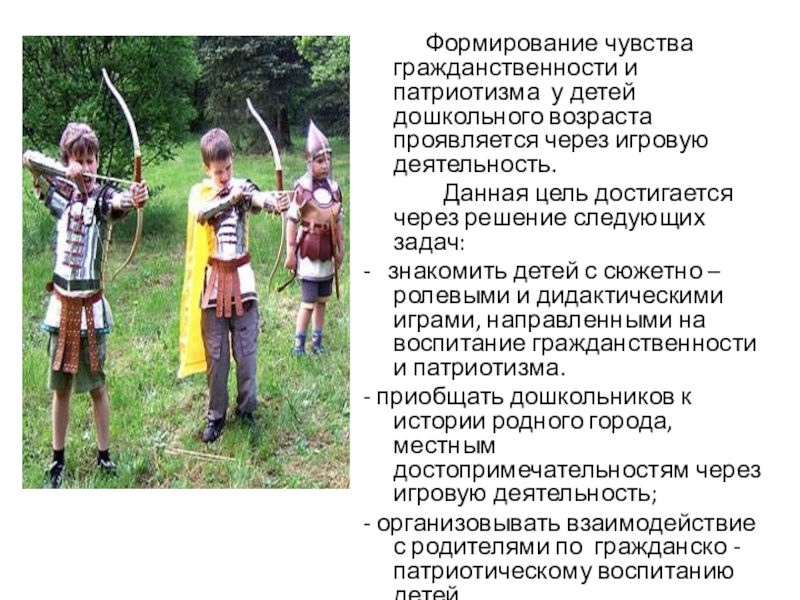 Образовательные – знакомить детей с родным городом, его историей, символикой, достопримечательностями, знакомить с культурой и традициями; закреплять понятие о «семье», умение определять наименование родственных отношений между близкими членами семьи; знакомство с народным фольклором, народными подвижными играми, народными промыслами; формировать знания об армии, об особенностях военной службы.