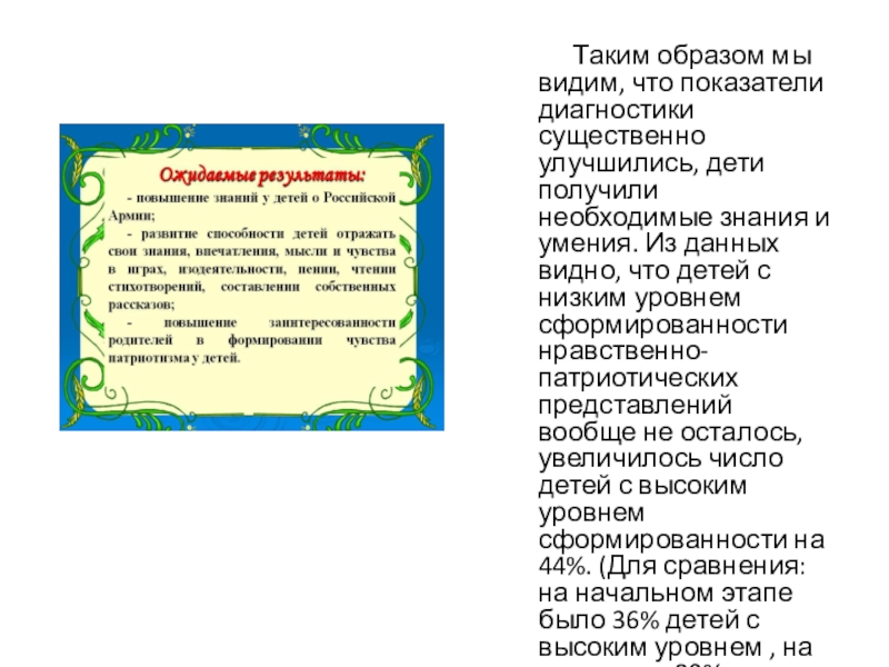 показатели диагностики существенно улучшились, дети получили необходимые знания и умения. Из данных видно, что детей с низким уровнем сформированности нравственно-патриотических представлений вообще не осталось, увеличилось число детей с высоким уровнем сформированности на 44%. (Для сравнения: на начальном этапе было 36% детей с высоким уровнем , на конечном -80% с высоким уровнем сформированности.)