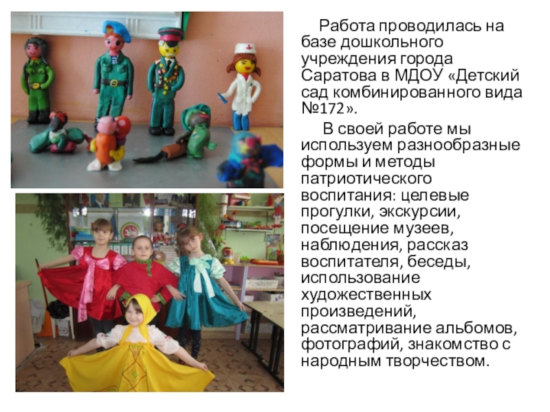 В своей работе мы используем разнообразные формы и методы патриотического воспитания: целевые прогулки, экскурсии, посещение музеев, наблюдения, рассказ воспитателя, беседы, использование художественных произведений, рассматривание альбомов, фотографий, знакомство с народным творчеством.