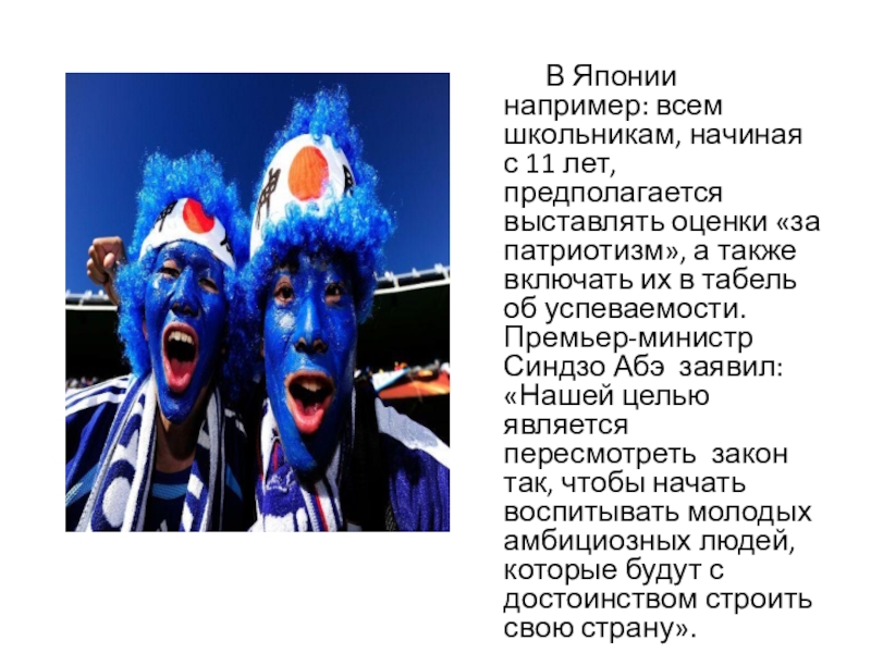 начиная с 11 лет, предполагается выставлять оценки «за патриотизм», а также включать их в табель об успеваемости. Премьер-министр Синдзо Абэ заявил: «Нашей целью является пересмотреть закон так, чтобы начать воспитывать молодых амбициозных людей, которые будут с достоинством строить свою страну».