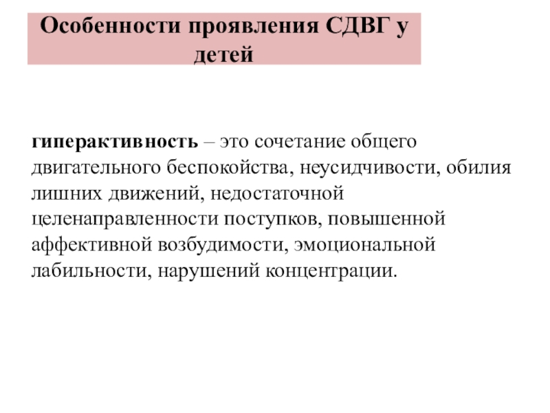 неусидчивости, обилия лишних движений, недостаточной целенаправленности поступков, повышенной аффективной возбудимости, эмоциональной лабильности, нарушений концентрации.
