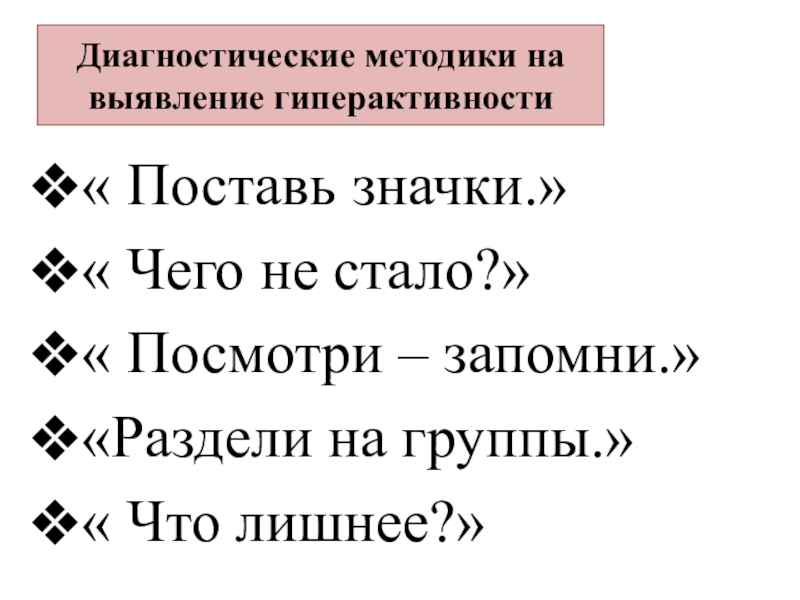Слайд 8Диагностические методики на выявление гиперактивности