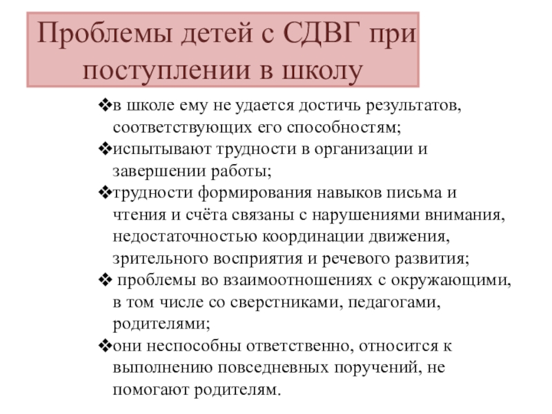 Слайд 7Проблемы детей с СДВГ при поступлении в школу