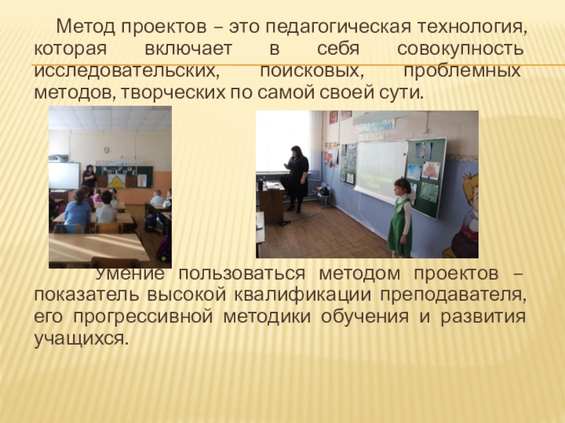 Умение пользоваться методом проектов – показатель высокой квалификации преподавателя, его прогрессивной методики обучения и развития учащихся.