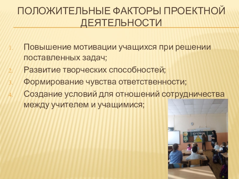 Слайд 16Положительные факторы проектной деятельности