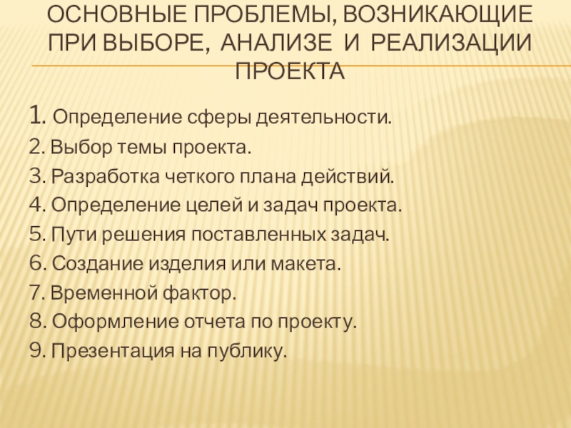 Слайд 15Основные проблемы, возникающие при выборе, анализе и реализации проекта