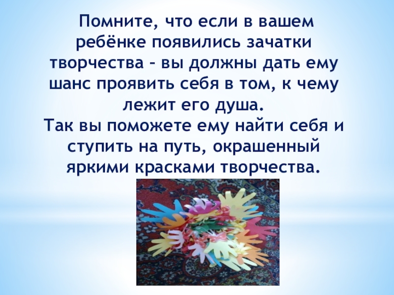 Слайд 20 Помните, что если в вашем ребёнке появились зачатки творчества –
