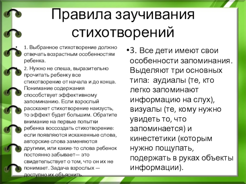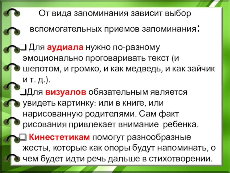 3. Все дети имеют свои особенности запоминания. Выделяют три основных типа: аудиалы (те, кто легко запоминают информацию на слух), визуалы (те, кому нужно увидеть то, что запоминается) и кинестетики (которым нужно пощупать, подержать в руках объекты информации).