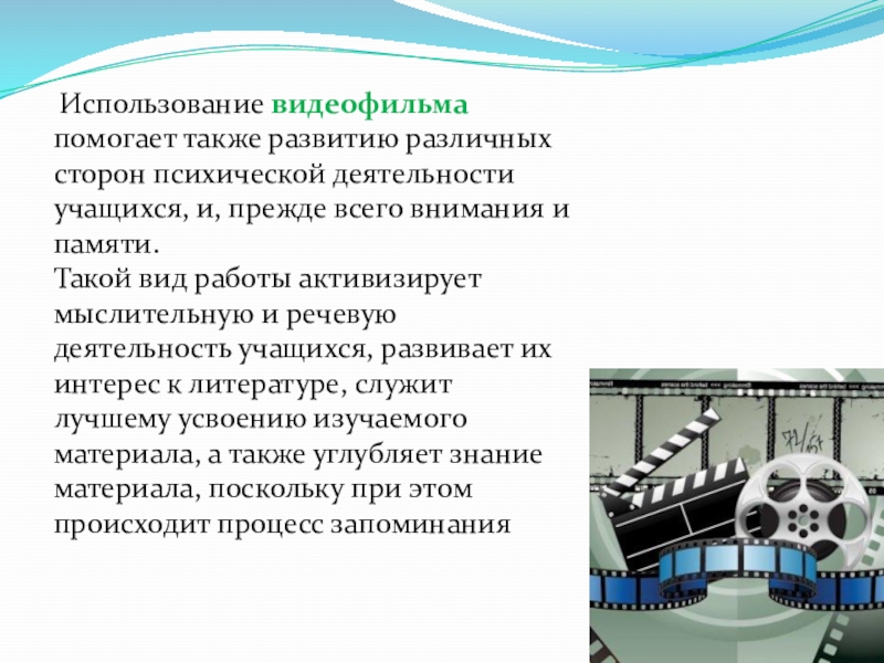 Слайд 12 Использование видеофильма помогает также развитию различных сторон психической деятельности учащихся,