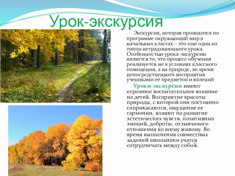 Уроки-экскурсии имеют огромное воспитательное влияние на детей. Восприятие красоты природы, с которой они постоянно соприкасаются, ощущение ее гармонии, влияют на развитие эстетических чувств, позитивных эмоций, доброты, отзывчивого отношения ко всему живому. Во время выполнения совместных заданий школьники учатся сотрудничать между собой.