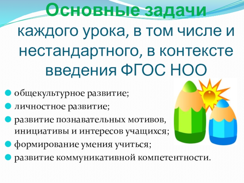 Слайд 4Основные задачи каждого урока, в том числе и нестандартного, в контексте