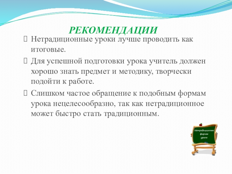 Залог успеха вашего нетрадиционного урока – заблаговременная, тщательная, четко спланированная подготовка, глубокое продумывание и осмысливание форм и методов его проведения.