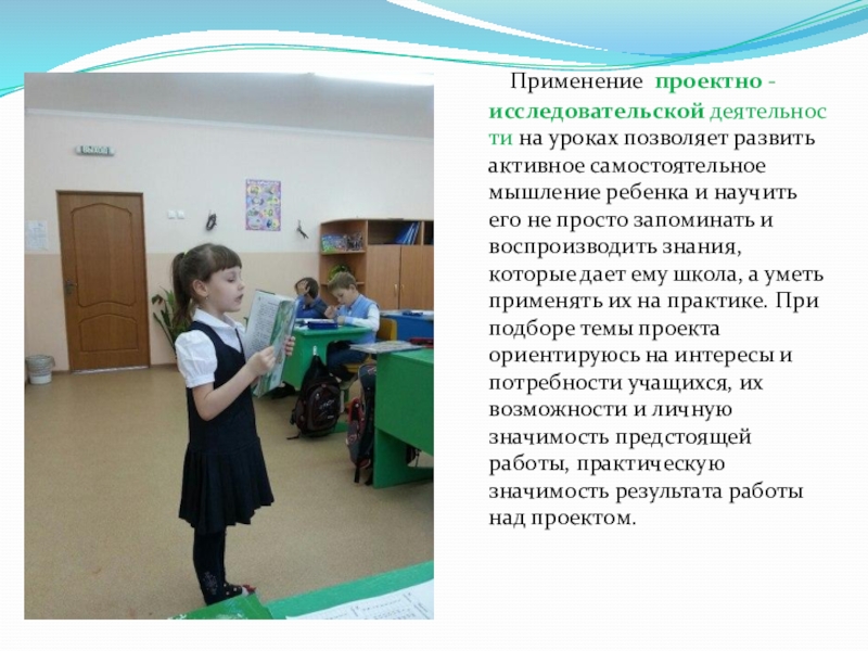 Слайд 16 Применение проектно - исследовательской деятельности на уроках позволяет развить активное самостоятельное мышление ребенка