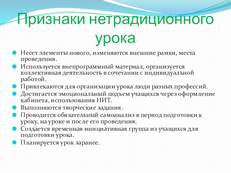 Слайд 7Признаки нетрадиционного урока