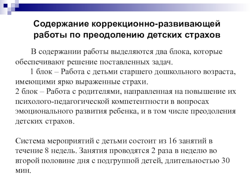 Содержание коррекционно-развивающей работы по преодолению детских страхов    В содержании работы выделяются два блока, которые