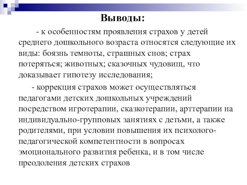 Выводы:		 - к особенностям проявления страхов у детей среднего дошкольного возраста относятся следующие их виды: боязнь темноты,