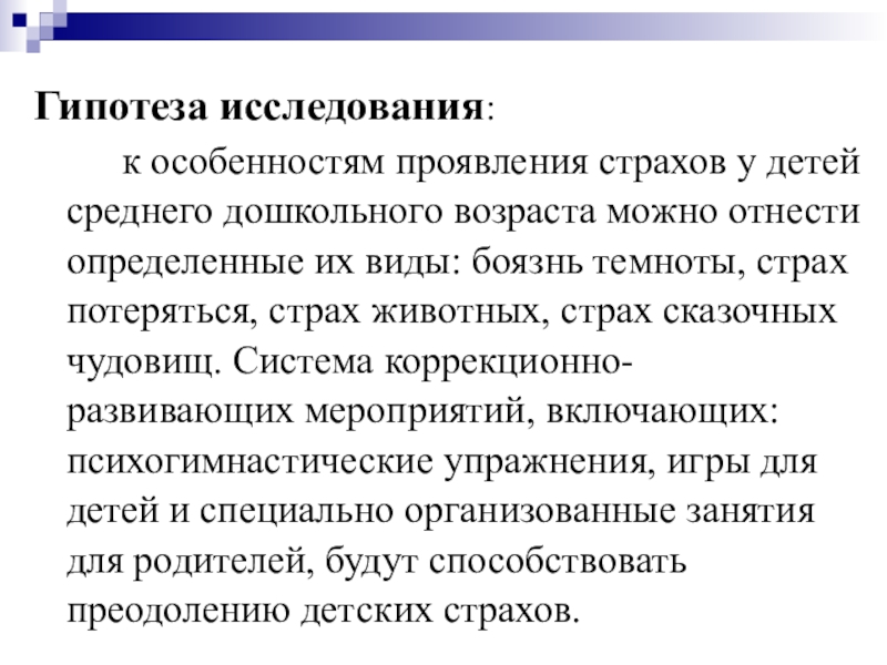 Гипотеза исследования: 		к особенностям проявления страхов у детей среднего дошкольного возраста можно отнести определенные их виды: боязнь