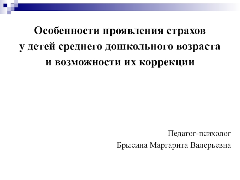 Особенности проявления страхову детей среднего дошкольного возрастаи возможности их коррекции 		  Педагог-психологБрысина Маргарита Валерьевна