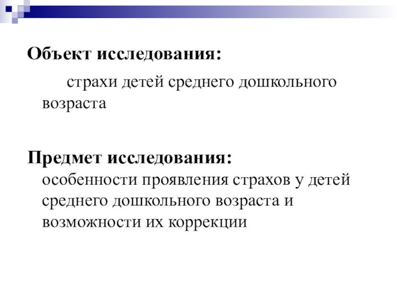 Объект исследования: 		страхи детей среднего дошкольного возрастаПредмет исследования: 				особенности проявления страхов у детей среднего дошкольного возраста и