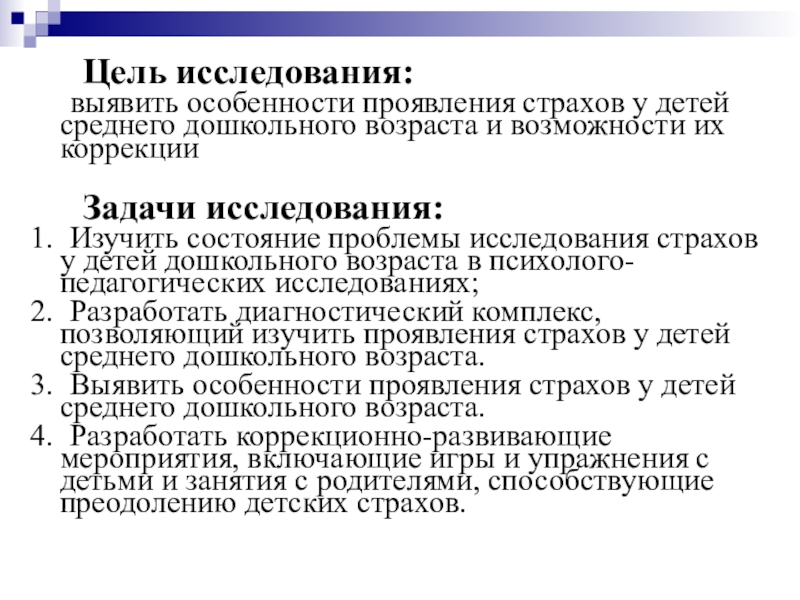 Объект исследования: страхи детей среднего дошкольного возрастаПредмет исследования: особенности проявления страхов у детей среднего дошкольного возраста и возможности их коррекции