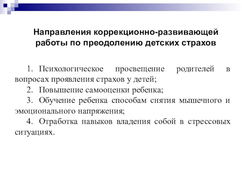 Направления коррекционно-развивающей работы по преодолению детских страхов1.	Психологическое просвещение родителей в вопросах проявления страхов у детей;2.	Повышение самооценки ребенка;3.	Обучение