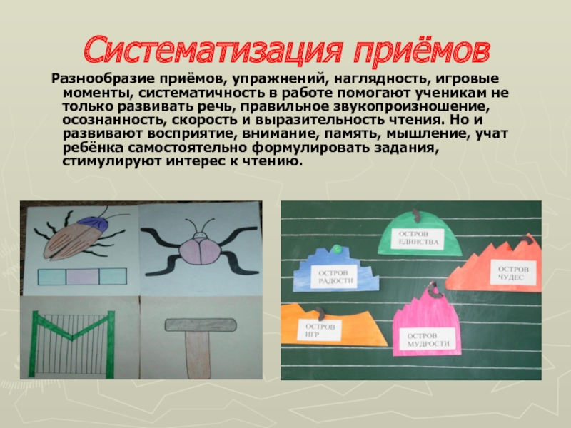Разнообразие приёмов, упражнений, наглядность, игровые моменты, систематичность