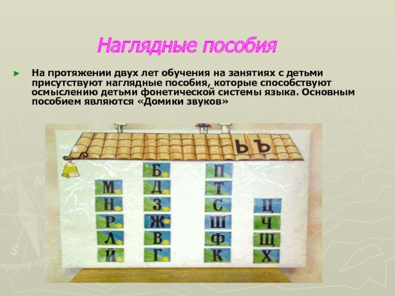 наглядные пособия, которые способствуют осмыслению детьми фонетической системы языка. Основным пособием являются «Домики звуков»