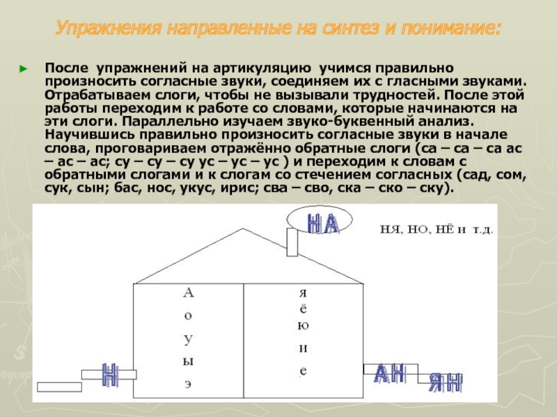 произносить согласные звуки, соединяем их с гласными звуками. Отрабатываем слоги, чтобы не вызывали трудностей. После этой работы переходим к работе со словами, которые начинаются на эти слоги. Параллельно изучаем звуко-буквенный анализ. Научившись правильно произносить согласные звуки в начале слова, проговариваем отражённо обратные слоги (са – са – са ас – ас – ас; су – су – су ус – ус – ус ) и переходим к словам с обратными слогами и к слогам со стечением согласных (сад, сом, сук, сын; бас, нос, укус, ирис; сва – сво, ска – ско – ску).