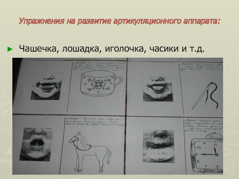 Слайд 10Упражнения на развитие артикуляционного аппарата: