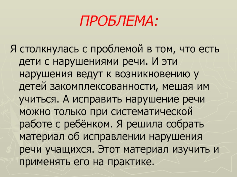 речи. И эти нарушения ведут к возникновению у детей закомплексованности, мешая им учиться. А исправить нарушение речи можно только при систематической работе с ребёнком. Я решила собрать материал об исправлении нарушения речи учащихся. Этот материал изучить и применять его на практике.